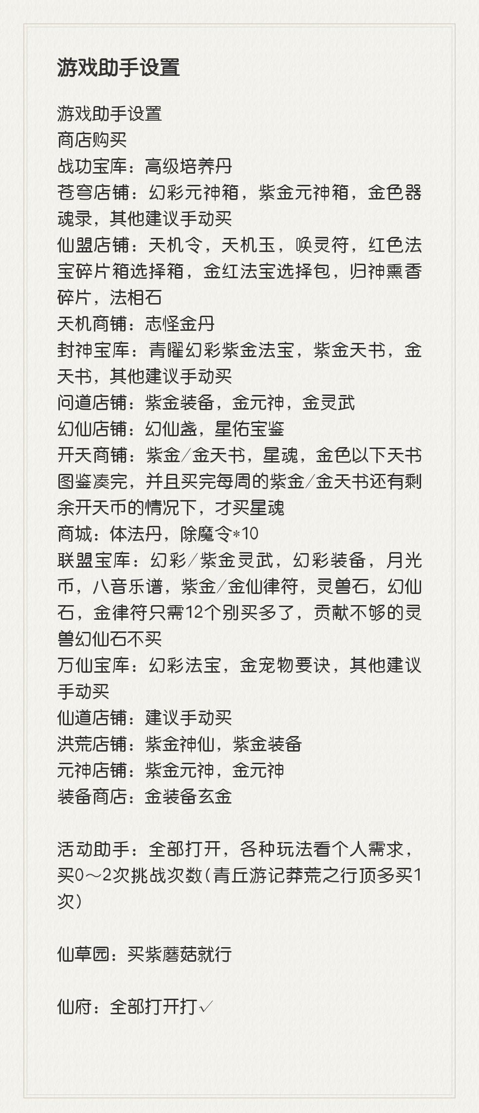 活动助手:全部打开,各种玩法看个人需求,买0~2次挑战次数(青丘游记莽荒之行顶多买1次)