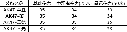 小结:AK47-策有着距修加强,远距离伤害达到了34点,要比其他武器高出1点。而孟德由于有伤害不受距离衰减的属性加成,是本次对比枪械中表现最佳的。实战中,远距离步枪对枪的频率还是不大的,所以策这个距修加强也算强力!