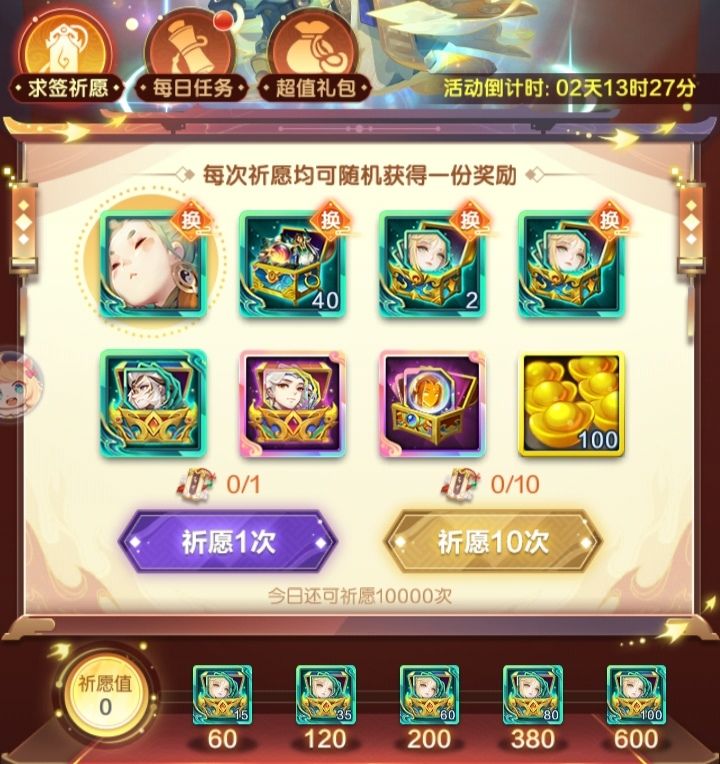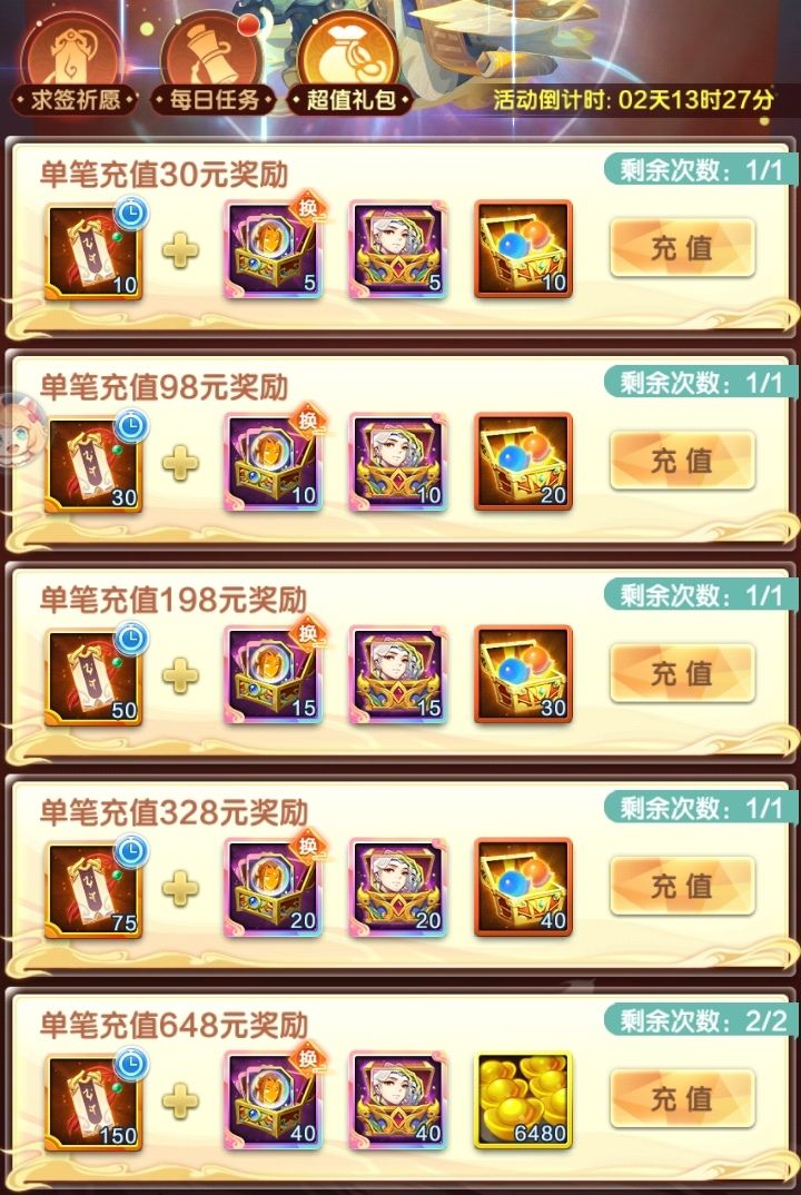 求签充值比请仙强点,充30+98+198+328,654元165个签,算上元宝任务的45签共210签,210抽过程中送的碎片加上箱子里的110碎片,完全足够拿个1星青曜3了(运气好的能少充个30,运气差的还要再多充个30),甚至幻彩碎片都够合成个幻彩3了,建议月氪3000以上的充。