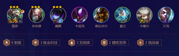 2、阵容羁绊:4刺客3炼金科技3发明家2精密发条2挑战者