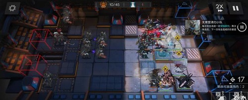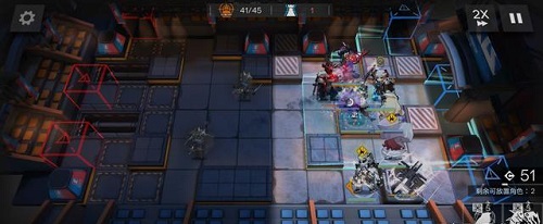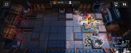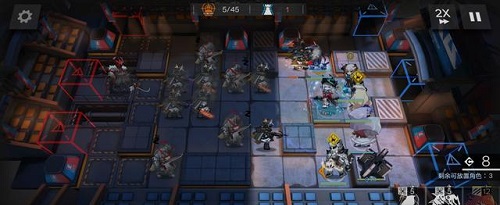 3、部署顺序很简单,开局部署桃金娘冲上攻击,然后部署红蒂冲上攻击,点灯开格子用的,很关键,然后部署山在下路冲左侧攻击,部署煌或者羽毛笔冲下方攻击,高台补夜莺冲上攻击,最后放塞妈冲上攻击。
