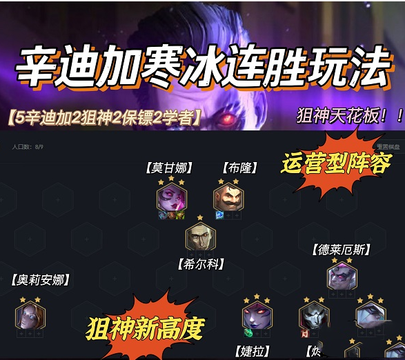 前期用2保镖2狙神打工,五人口上婕拉补3辛迪加羁绊,3-2上六人口!囤50金币慢慢用利息搜牌,优先找三星寒冰,其次是三星婕拉!血量稳定后可以考虑上七人口提升莫甘娜质量~优先在上八之前找到三星寒冰+二星莫甘娜!