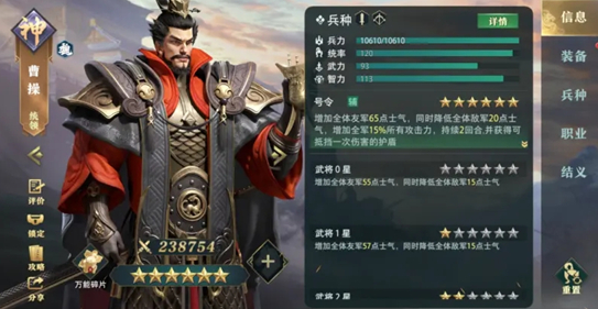 技能:号令——增加全军士气,降低敌军士气,随星级增高增气减气量会增加,3星额外加全军攻击,6星再额外加抵挡一次伤害的护盾。