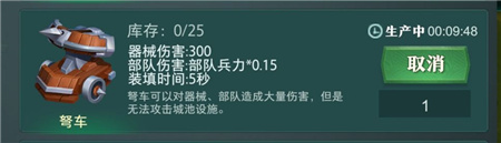 守城战中弩车发挥的作用就要比投石车高了,守城是不需要投石车的。守城时可多建造弩车用来远距离攻击敌方投石车、部队以及火牛等单位。
