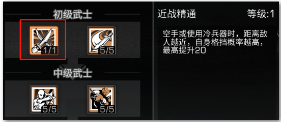1、当武士等级为初级武士时可提升近战精通技能,最高可提升20点格挡值。