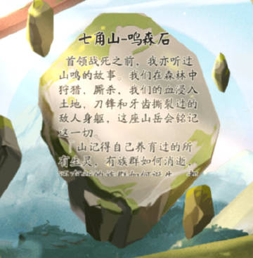 首领战死之前,我亦听过山鸣的故事。我们在森林中狩猎,厮杀,我们的血浸入土地,刀锋和牙齿撕裂过的敌人身躯,这座山岳会铭记这一切。具体详细线索,请看下面图片:
