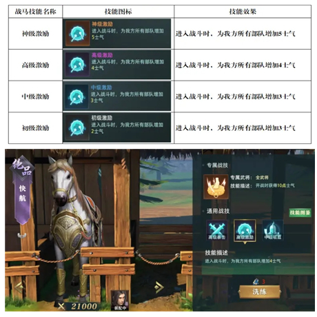 当主公1号位、2号位、3号位装备神级战马并都有神级激励技能,4号位、5号位装备快航战马且都有高级激励技能时,那么开局4号位、5号位便有33点士气,也只需要携带3个鼓,4号位、5号位便可以放出技能。