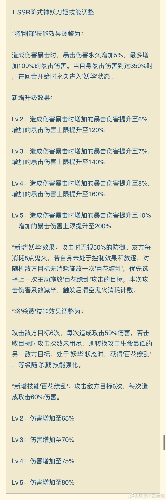 普攻不变;被动一个大招+爆伤60%,最高有200%的爆伤加成,总爆伤达到350%就可以进“妖华”状态(忽视50%防御,友方消耗8火白嫖一个240%系数的单体伤害技能);“妖华”状态大招系数从348%→480%,但是没有击杀+次数的效果了。