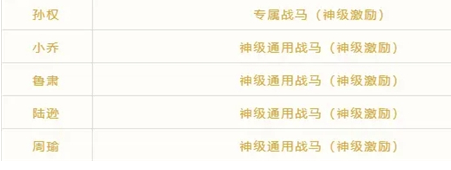 这个配置,全军5个武将进场士气35点(5个神级激励25点,孙权专属战马10点)。其中孙权、小乔、鲁肃可以替换为任意鼓将,但如果孙权被替换,那么全体武将进场士气就只有25点了,如果替换成其他国家的鼓将,队伍就少一点国家加成。