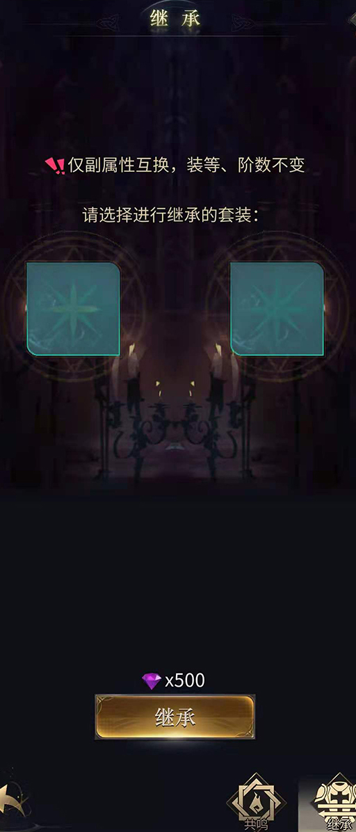 最后来说说套服的继承。在套服共鸣界面的右下角可以看到继承的图标,点进去就是套服继承界面,两件相同套服类型且相同部位的套服之间可进行继承操作,继承需消耗钻石;继承后两件套服的随机属性将对调,装备的等级与阶数保持不变;进行过继承的套服将变为已绑定状态。