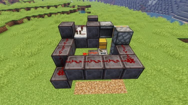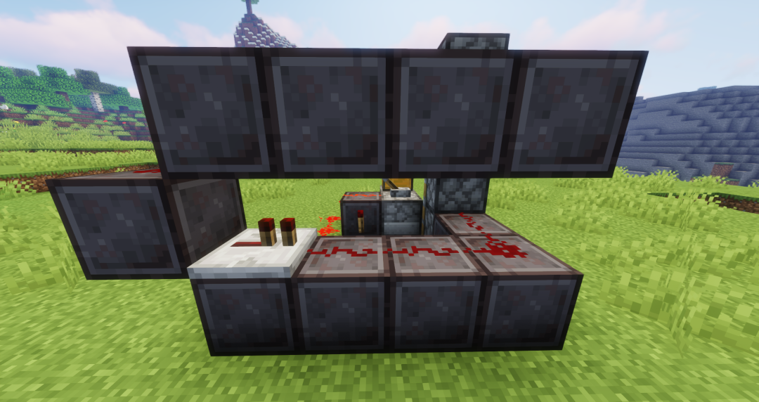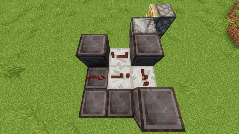 如图继续铺设普通方块和红石粉,使红石线路与活塞相连