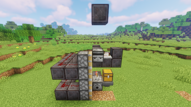 在发射器的左方放置四个普通活塞,并在如图所示位置放置一个侦测器(注意侦测器的脸要面向活塞一方哦)