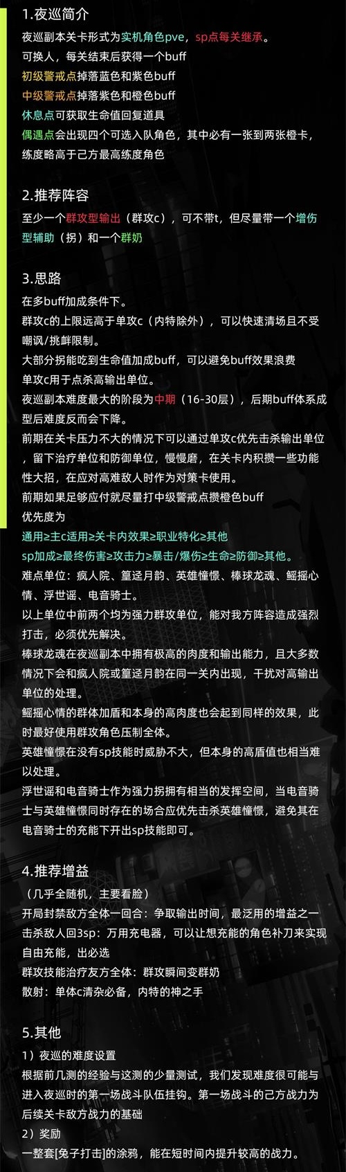 1.夜巡简介夜巡副本关卡形式为实机角色pve,sp点每关继承。