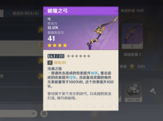 解析:破魔之弓是有一个常驻被动,一个触发被动的。触发被动要求大招能量等于100%,这基本等于要保持特效的话,角色不能开大,不能带追忆4件套。好在还有一个常驻的被动,精5破魔有32%的普攻伤害提升。这个提升是不需要任何触发条件的,不像试作那样要命中怪物弱点,也不像弓藏那样要牺牲重击伤害。