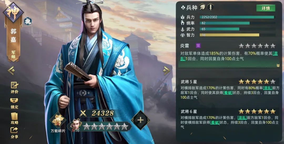 当武将星级达到6星后,技能中的【混乱】效果变成必定命中郭嘉对面的第一个敌军,控制更加稳定,【看破】效果命中的对象则从前方敌军变为横排敌军。