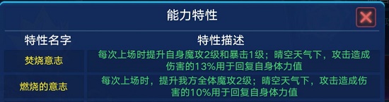 ⑶特性带燃烧的意志的吉拉每次上场能够提升队友魔攻两级(开局先用吉拉,不放技能,换别的亚比,再把吉拉换上来,那就能提升队友四级魔攻,来达到一个快速提属,辅助队友输出的一个作用)
