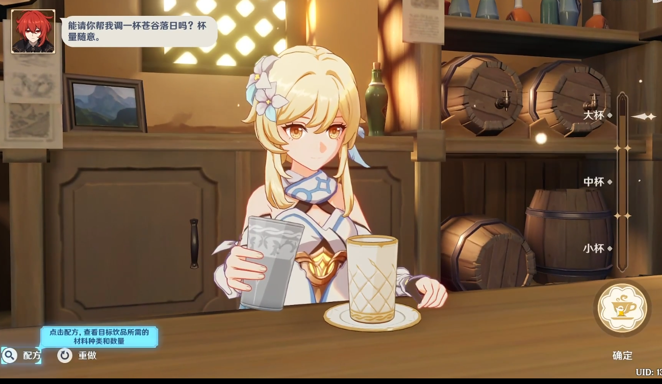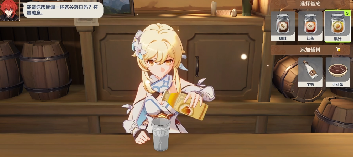 2.根据迪卢克的提示,我们直接加入三杯果汁,进行一番QTE后随意选择杯量即可(中杯大杯超大杯bushi)
