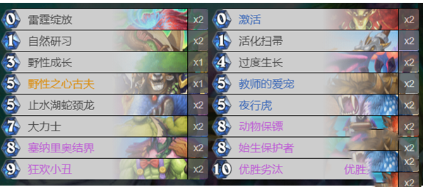 比较传统的一套跳费保镖德。卡组主要思路是前期快速跳费,这套牌多带了一个三费的成长,力求能快速跳费(事实上有古夫就能跳的很快)中期靠动物保镖或者止水湖蛇颈龙配合扫帚解场。卡组的主要站场生物是打出优胜劣汰后的狂欢小丑两波或者始生保护者检索10费生物的一波站场。保镖德这个思路只要跳费快,中期的场面膨胀能力很强。