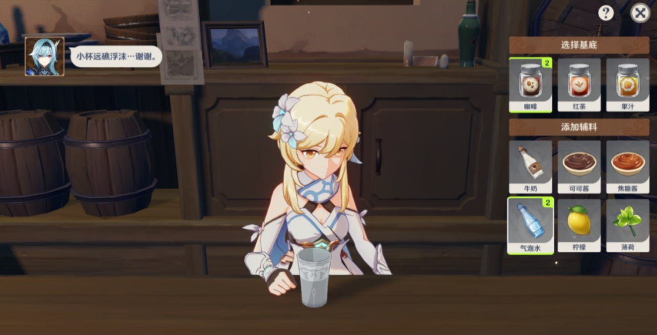 2.根据优拉和派蒙的提示,我们加入两份咖啡两份气泡水。然后进行QTE,最后选择小杯量即可完成。