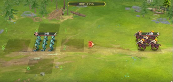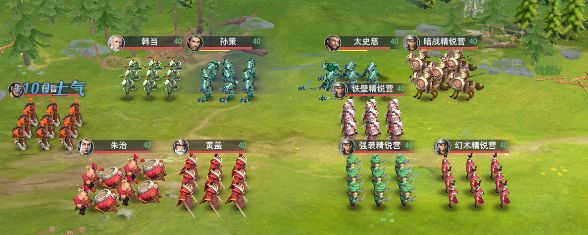 使用如图所示的阵型和站位,中间竖排不要放太多武将,主要输出敌方太史慈,朱治可以给队友回复士气,非常实用轻松过关
