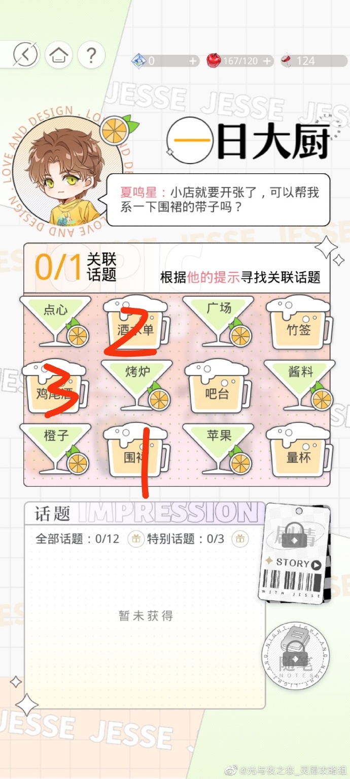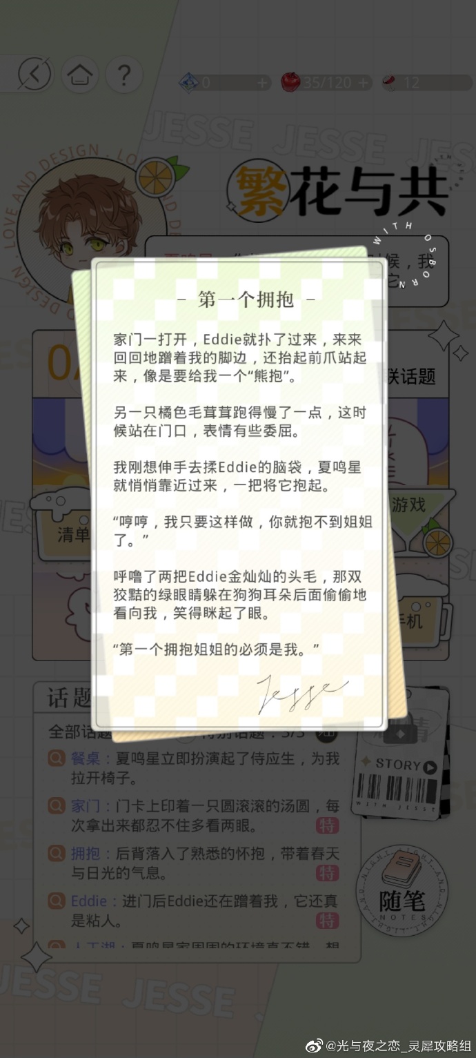 1天气→2中午→3人工湖→4、5、6、三个顺序可随意(Eddie,拥抱,家门)→7餐桌 →8清单→9花束→10手机→11沙发→12游戏