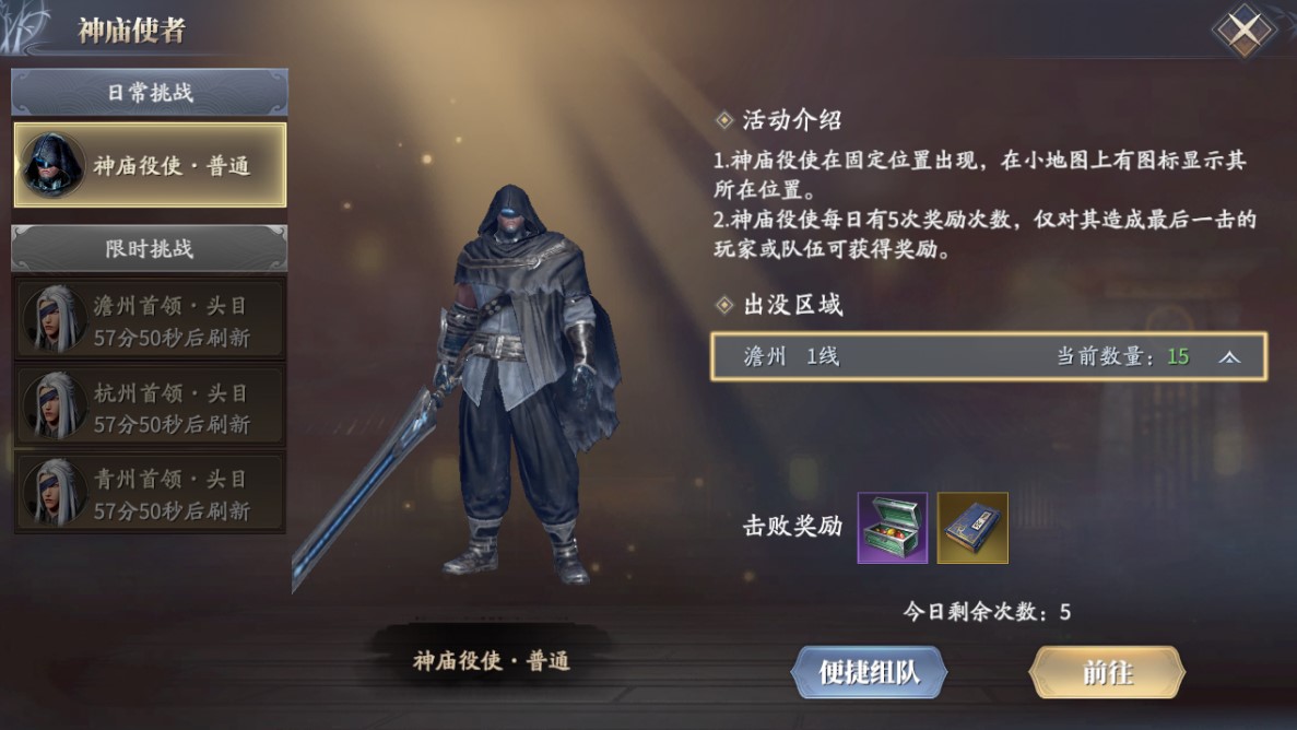 神庙使者每天可以挑战五次,难度较高,建议大家组队前往。