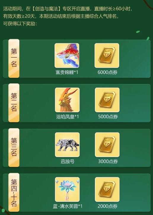 活动期间,在[创造与魔法]专区开启直播,直播时长≥60小时,有效天数220天,本期活动结束后根据主播综合人气排名,可获得以下奖励: