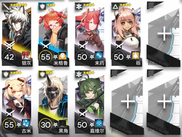 开局如下图所示顺序部署:银灰(1杀后开真银斩) → 末药(医疗)