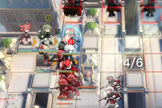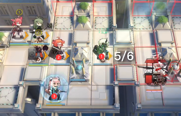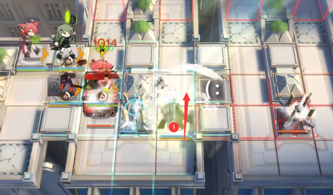 这波真银斩打完上面的甜品车即可撤退银灰,如下图所示部署防线:黑角 → 砾 → 米格鲁,等待银灰再部署完成。