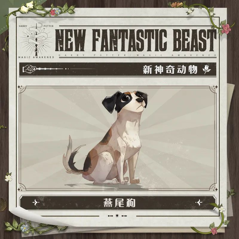 这只神奇动物看上去和麻瓜家庭中的宠物狗别无二致,除了——它的尾巴!正如它的名字,「燕尾狗」拥有一条分叉的奇特尾巴,特别引人注意。(同学们可通过「通行证礼盒」获得全新神奇动物「燕尾狗」。)