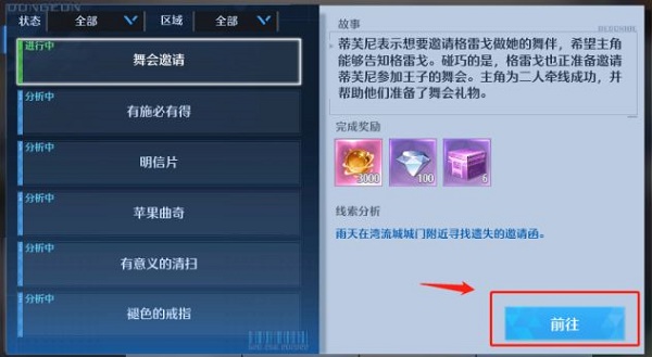 一、触发条件:需要在雨天的湾流城城门附近获取王子遗失的舞会邀请函。坐标(-830,-300)雨天到达湾流城城门口之后会有一个发光的箱子,点击开启即可。