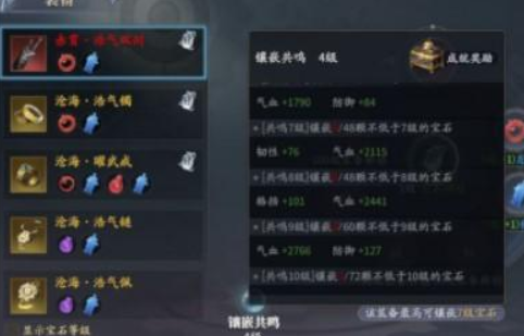 宝石镶嵌最需要注意的技巧,就是激活宝石的镶嵌共鸣属性。如图所示,当玩家身上的宝石达到共鸣要求时,能够激活镶嵌共鸣,给玩家带来大幅度的属性加成。因此不要盯着一颗宝石强化,结合自己的装备实力进行提升即可。