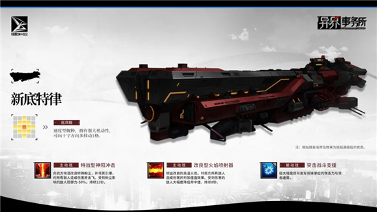 SSR巡洋舰“新底特律”的主动技能可对前方所有敌人造成伤害并附加僵直效果,被动技能可极大幅度提升友军前锋单位的攻击力与攻击速度。