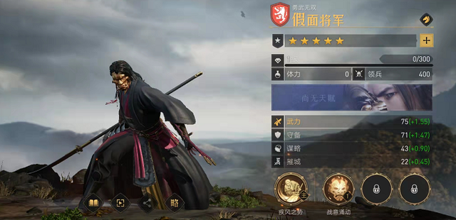 1、假面将军属于打连击的辅助,兵种特性骑兵,战斗风格勇武。