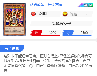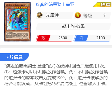 熔岩魔神,这张阴间卡组的最爱,终于站上了卡组核心的位置。他的烧血效果只是附送,关键就是减少对面的攻击频率。之后我们用来通招的七星怪要选用不用祭品的,我选择疾奔的暗黑骑士盖亚,可变机兽应该也可以。