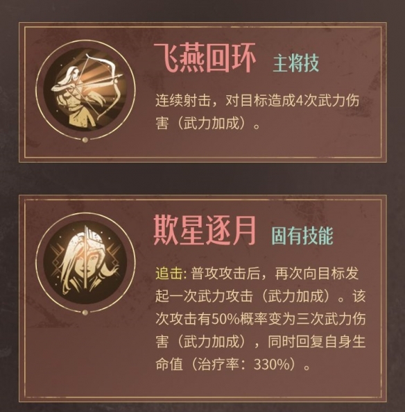 追击:普通攻击后,再次向目标发起一次武力攻击(武力加成),该次攻击有50%概率变为三次武力伤害(武力加成),同时回复自身生命值(治疗率330%)。