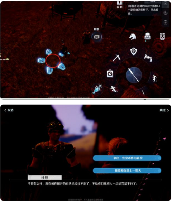 二、捡起杜恩身前石堆中央的石头,与其对话(两种选择均可,对任务流程和结局无影响)。