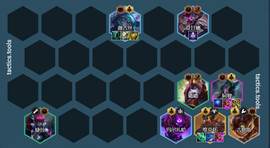 英雄组成:吉格斯、璐璐、婕拉、薇古丝、马尔扎哈、阿狸、维克托、莫甘娜