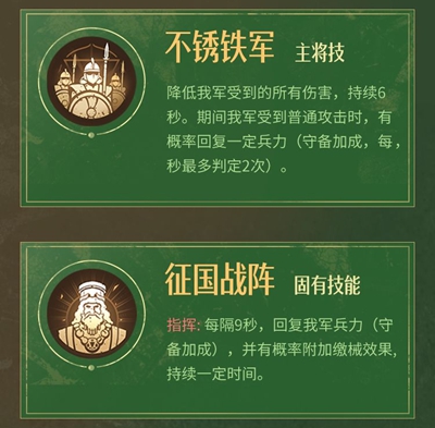 指挥:每隔9秒,回复我军兵力(守备加成),并有概率附加缴械效果,持续定时间。