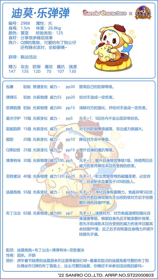 3、简析:虎年春节缺席的迪莫原来在这里等着我们呀~最喜欢甜点的迪莫抱着可爱的布丁狗玩偶坐在Q弹的布丁靠垫上,这么可爱的迪莫,你确定不来参加活动抱回家吗~
