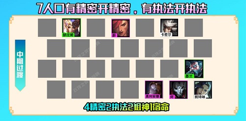 12.中期阵容:7人口开出4精密2执法2狙神1宿命羁绊,4精密能够增加高额的攻速,搭配女警的平A能够打出不错的单体伤害。其次精密里面的基兰和发条两大控制能够弥补阵容缺少控制这一致命缺点。7人口只要找到核心体系卡牌就可以直接拉8人口找杰斯开4执法。