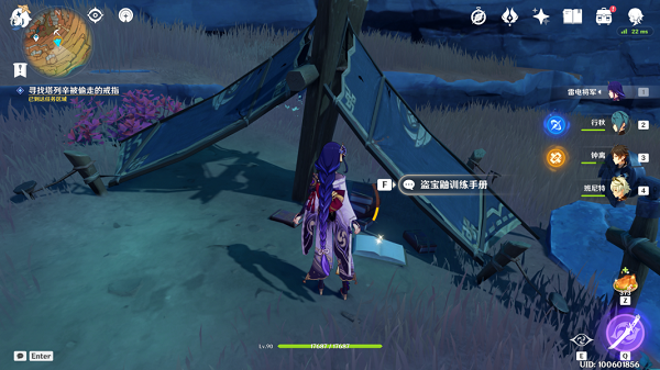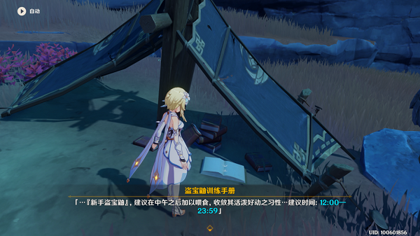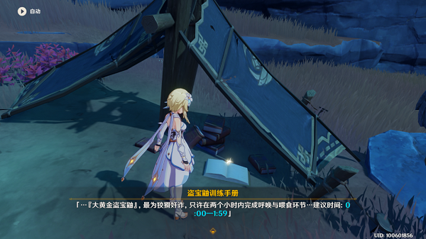 3、 到达任务区域在一旁的营地中有一本《盗宝鼬训练手册》(不想看的直接看下文即可),阅读后来到图中大石头处根据《盗宝鼬训练手册》的内容调整时间并吹口哨