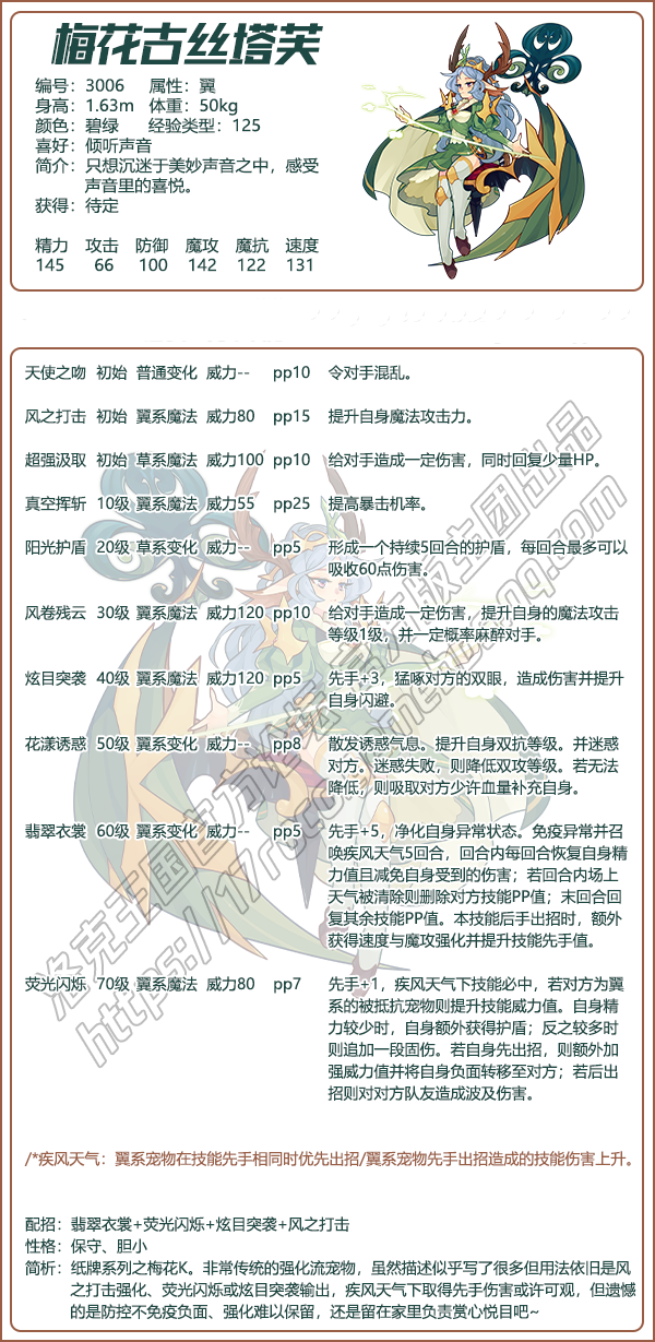 纸牌系列之梅花K。非常传统的强化流宠物,虽然描述似乎写了很多但用法依旧是风之打击强化、荧光闪烁或炫目突袭输出,疾风天气下取得先手伤害或许可观,但遗憾的是防控不免疫负面、强化难以保留,还是留在家里负责赏心悦目吧~