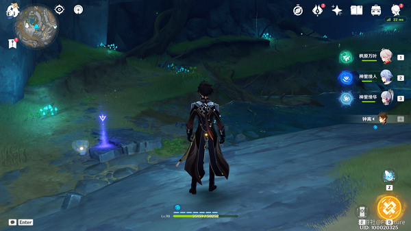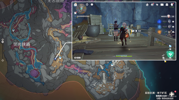 在层岩巨渊地下矿区的地下水泽区域,我们可以在图示位置找到1个观景点,旁边还有1只仙灵。