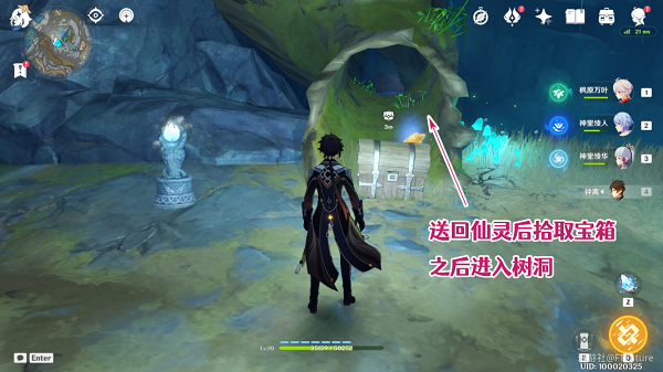 将这里的仙灵送回到仙灵台座,会出现1个普通的宝箱。而在拾取宝箱的时候,我们就会自然而然的注意到这里的树洞,捡完宝箱后,我们就需要进入这个树洞内。