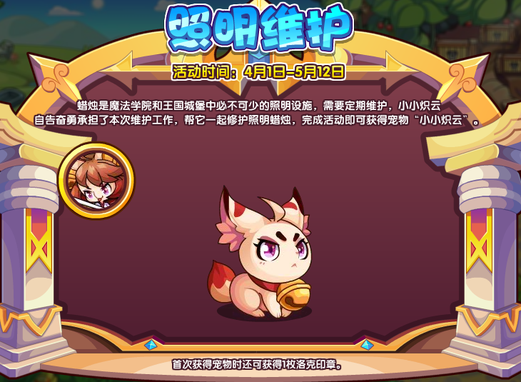 蜡烛是魔法学院和王国城堡中必不可少的照明设施,需要定期维护,小小炽云自告奋勇承担了本次维护工作,帮它一起修护照明蜡烛,完成活动即可获得宠物”小小炽云“。
