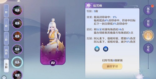 3、除了元素属性的加入,本次幻形符玩法的升级还加入了6张全新的幻形符。四阶幻形符孔雀姬和云狐,其中孔雀姬可以帮助玩家看见隐身单位,并且增加对隐身单位的伤害,可以配合输出职业用来对付隐攻宝宝;云狐则是提高5%的速度,减少5%的物防,可以搭配合欢等高速门派使用,但抢一速的同时需要注意生存空间。