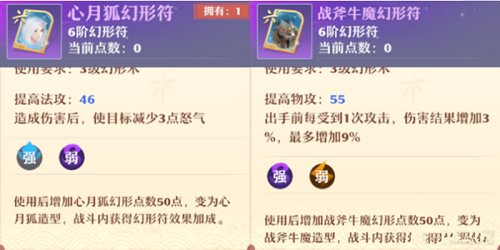 5、六阶幻形符心月狐和战斧牛魔,心月狐在提高法攻的同时可以减少目标的怒气,与法系输出门派简直是绝配,再也不用担心自己的AOE伤害会给对面送怒气了;战斧牛魔则是物理输出门派的福音,该幻形符在提高物攻的同时,还能够百分比提高伤害结果,最高可达到9%,非常适合用来点杀敌人。