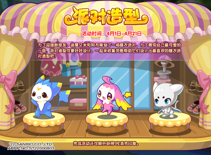 参加派对造型活动,活动获得:洛克印章,联动预约道具:睡衣派对门票