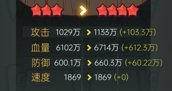 一颗皇冠之后,每提升一个星级,增加15%属性(攻击、防御、血量)。那么从一颗皇冠到四颗皇冠的属性提升为1*115%*115%*115%=1.52倍。并且四颗皇冠武将能觉醒前面两个技能(主动技能+被动1)。